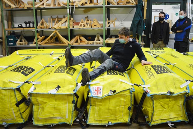 Er sprang von einer Leiter darauf und sagte nach dem Praxistest: „Als ich auf die Kissen gefallen bin, habe ich schon ein bisschen Widerstand gemerkt. Aber es ist auf jeden Fall besser, als auf den knallharten Boden zu fliegen“ – vor allem für das Arbeiten in Nischen eignen sich die Säcke, so Andrä.