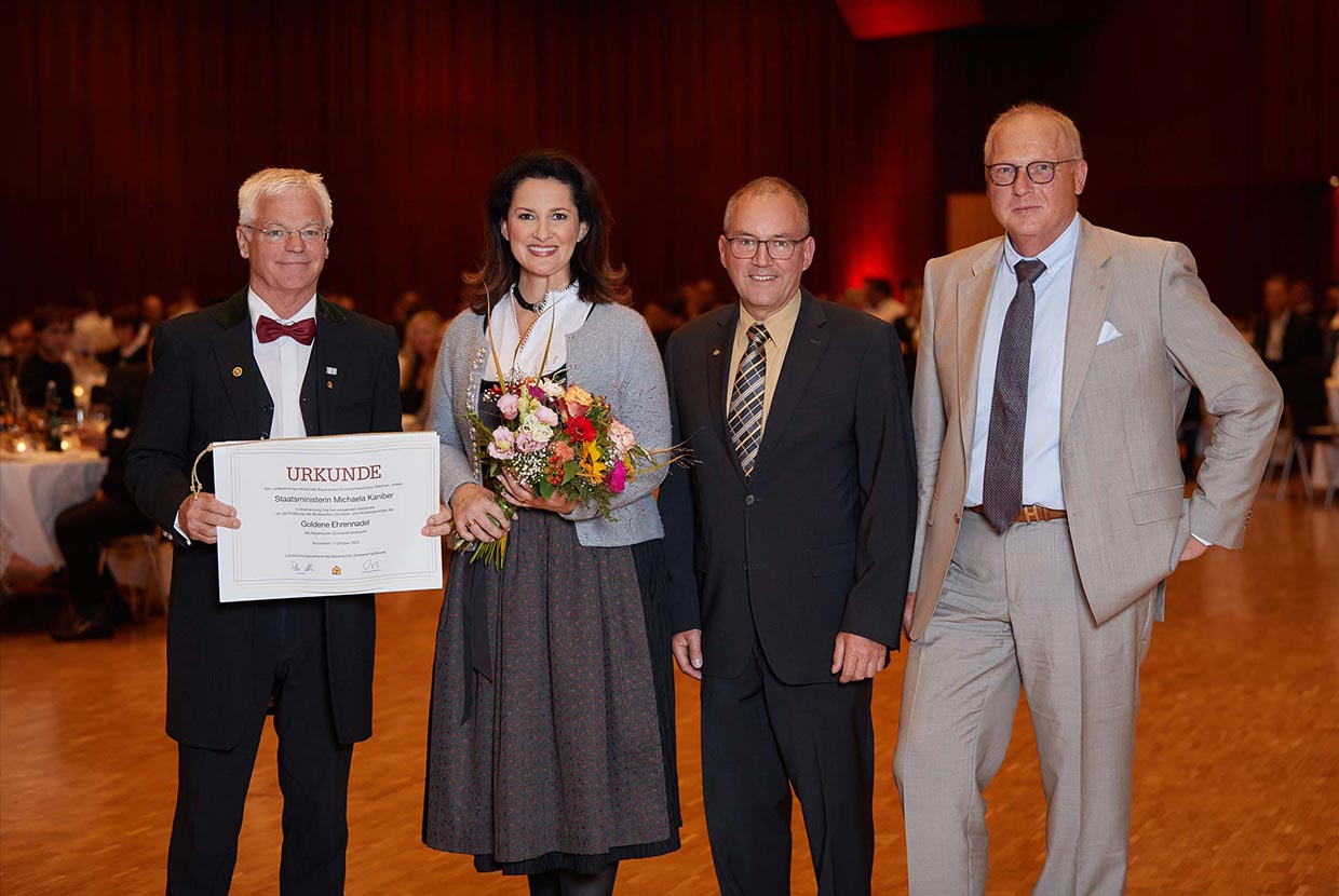 Der Landesinnungsverband des Bayerischen Zimmererhandwerks verlieh Staatsministerin Michaela Kaniber für Ihr Engagement um den Holzbau die Goldene Ehrennadel: Präsident Peter Aicher, Staatsministerin Michaela Kaniber, 2. Vizepräsident Hermann Lang und 1. Vizepräsident Alexander Gumpp (v,l,n,r.).
