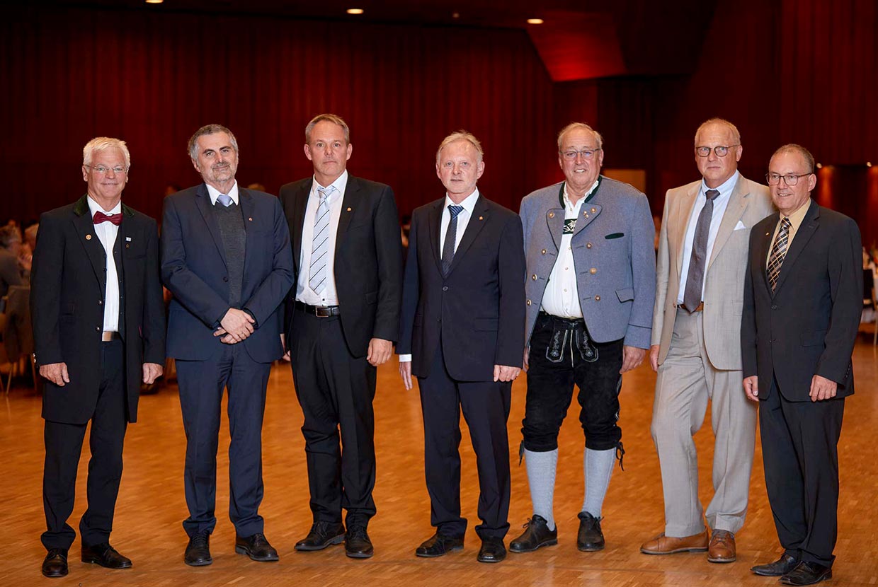 Besondere Verdienste würdigte der LIV mit weiteren Ehrennadeln: Präsident Peter Aicher, Ministerialdirigent Werner Lucha (Silberne Ehrennadel), Prof. Dr.-Ing. Marco Einhaus, Zimmermeister Gabriel Lerchenmüller, Zimmermeister Günther Stenglein (jew. Goldene Ehrennadel), 1. Vizepräsident Alexander Gumpp und 2. Vizepräsident Hermann Lang und (v,l,n,r.).