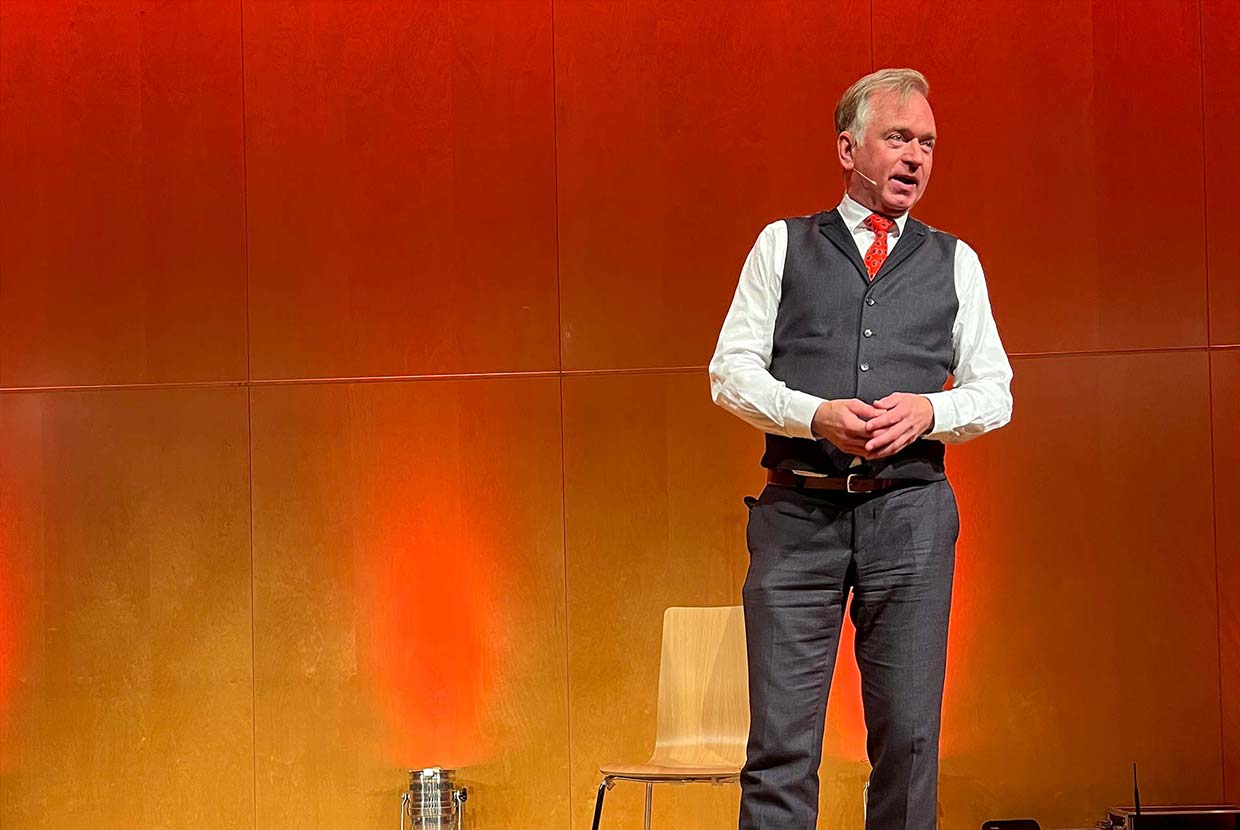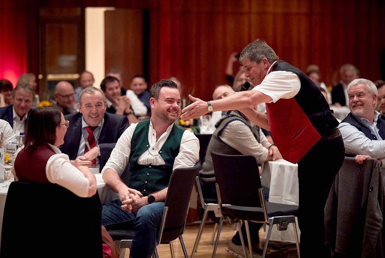 Am Samstagvormittag rundete eine Matinee mit Kabarettist Christian Springer das einzigartige Programm zum 75-jährigen Verbandsjubiläum ab. Der Münchner nahm mit einer Mischung aus Feinheit und Bosheit Bezug auf aktuelle Themen im Zimmereralltag wie Klimakatastrophe und Materialknappheit und sorgte dabei für viele Lacher bei Jung und Alt. Im Anschluss an seinen Auftritt bekam Springer von Verbandspräsident Peter Aicher und stv. Hauptgeschäftsführer Kai Gajewski einen Scheck für seinen 2012 gegründeten Verein „Orienthelfer e. V.“ überreicht. Ursprünglich zur schnellen und direkten Hilfe der Opfer des Syrienkriegs ins Leben gerufen, kümmert sich der Verband mittlerweile schwerpunktmäßig um Bildung und Hilfe zur Selbsthilfe.