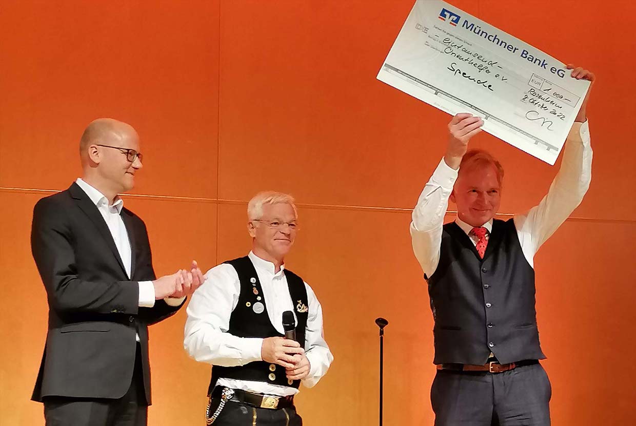 Kabarettist Christian Springer freute sich über den von Verbandspräsident Peter Aicher und stv. Hauptgeschäftsführer Kai Gajewski überreichten Scheck für seinen Verein „Orienthelfer e.V.“.
