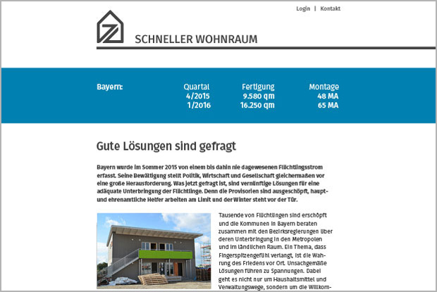 „Schneller Wohnraum“ lautet die Kampagne des Bayerischen Zimmerer- und Holzbaugewerbes für gute Lösungen vor Ort, bei der Suche nach geeigneten Flüchtlingsunterkünften. Die Internet-Seite bringt das Ehrenamt in Position – als ersten Ansprechpartner für Kommunen. Im internen Bereich können sich Betriebe austauschen, um gemeinsam anzupacken und den Bedarf an geeignetem Wohnraum schnell zu bedienen.